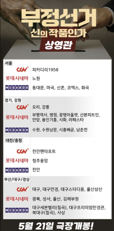 현재 ‘부정선거, 신의 작품인가’는 메가박스를 중심으로 상영 중입니다. 서울에서는 총 5개 상영관에서 상영되고 있으며, 경기 지역 3곳, 부산, 대구 등 경상권에 4곳의 상영관이 확보되었습니다. CGV에서는 현재 특별 편성 협의 중인 상태입니다. 아래에서 대표 상영관 리스트를 확인하세요.