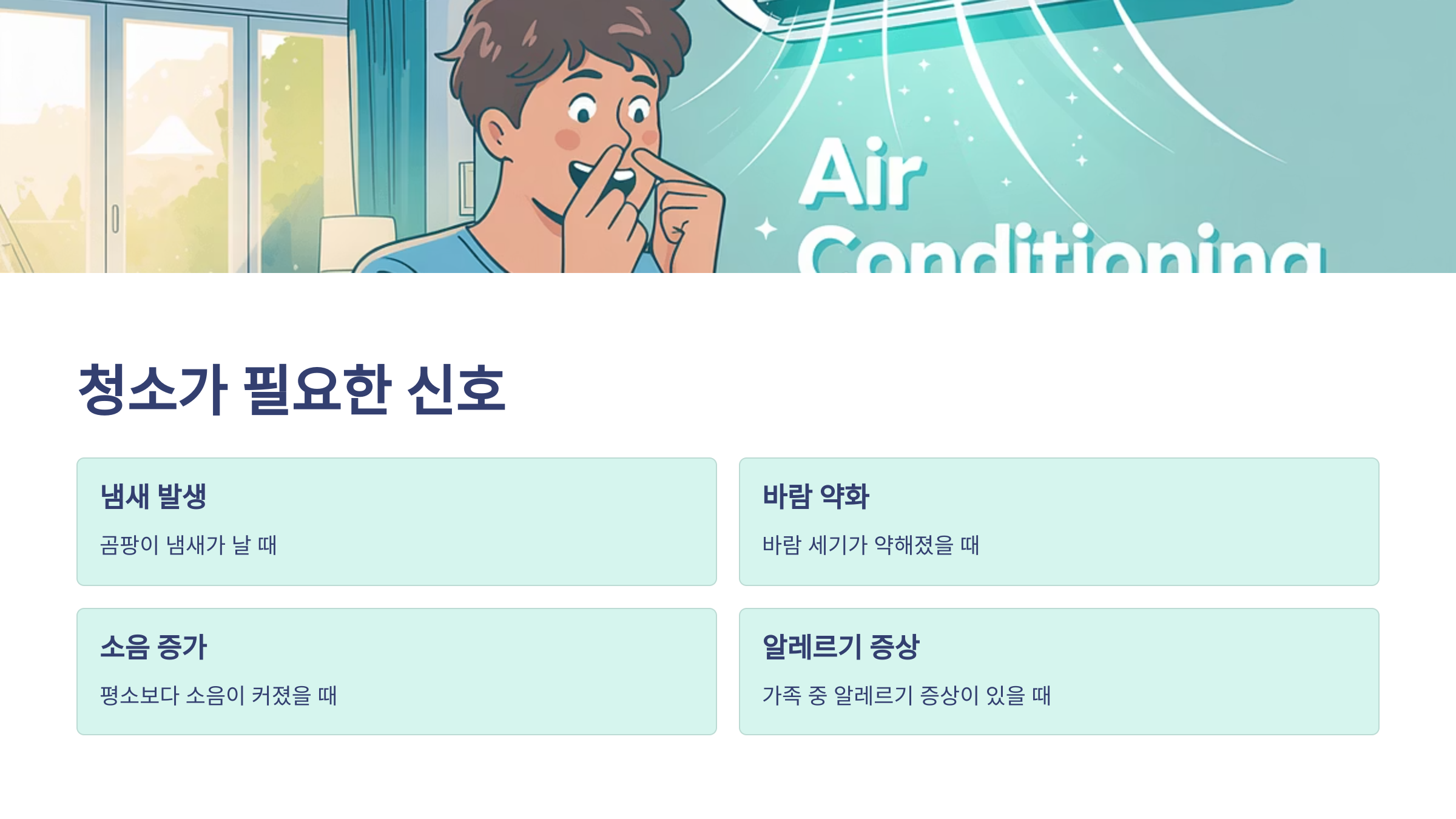 에어컨은 사용량에 따라 다르지만 1년에 한 번 정도 에어컨 청소비용을 투자해 관리하는 것이 가장 좋습니다. 특히 곰팡이 냄새가 나거나 바람이 약해지면 바로 청소를 고려해 보세요.